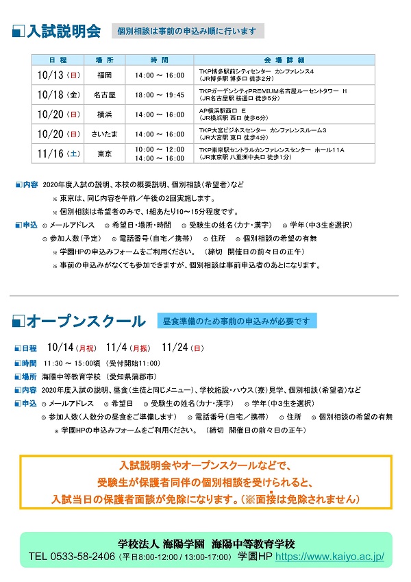 海陽中等教育学校〈愛知県蒲郡市。男子校〉が、来春2020年2月8日(土)に、2020年度の新高校1年生を対象とした編入試験を実施することを公表しました。実質的には高校からの入学者募集に近い「新高校1年生の4月編入」という形での「編入学試験」を、本校と東京会場で2020年2月8日(土)に実施します。また、同日に「帰国生入試」も実施します。