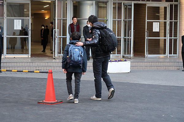受験生の来校が目立ち始めたのが7:10過ぎ。そこからは断続的に九段下と市ヶ谷の両方面から受験生が到着します。それぞれの塾の先生を見つけると、笑顔で駆け寄る受験生たち。朝日が差し込む学校前で繰り広げられるこの光景は中学受験ならではの名シーンです。「自分を信じて!」「最後まで諦めるな!!」。先生たちと熱い握手を交わし、待機場所の保護者控室へと向かいます。