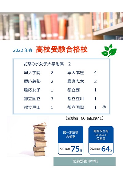 武蔵野東中学校(東京都小金井市)は、併設高校を持たない、全員が高校受験をする学校です。その武蔵野東中学校から、今年の高校受験の結果速報(受験者60名)が届きました。中学3年間で育まれる「未来への学びの力」がもたらす、確かな実績と進路実現への信頼を裏切らない結果は、“小さな巨人”の趣です。
