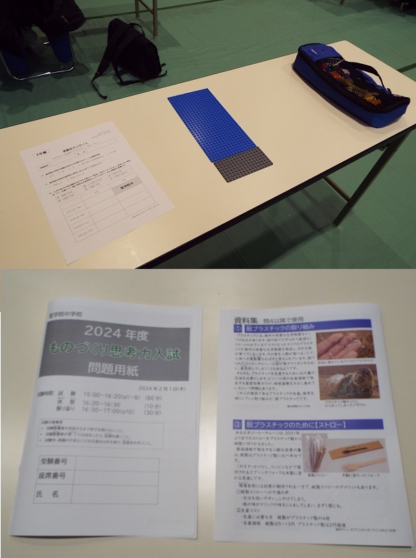「思考力」試験開始時に配られた「2024年度ものづくり思考力入試」の問題用紙と、「脱プラスチック」関連の話題(①~④)に加え、「⑤環境に配慮した過去の事例」、「⑥新しいものが生まれるとき」、「⑦便利を手放すことはできない!?」、「⑧ものごとの関係性・複雑性」と題した見出しの並ぶ、A3判用紙の表裏にカラー印刷された二つ折りの資料集を見ながら、受験生は問いに答えつつ、自分のアイディアをレゴブロックで作品化していきます。