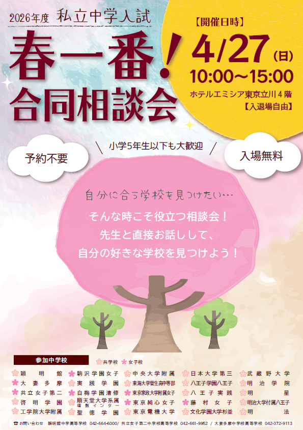 同校は4月27日(日)に行われる『春一番! 合同相談会』に参加します。25校の私立中学校が集まる相談会ですので、こちらも足を運んでいただければ各学校の教育が知ることができると思います。