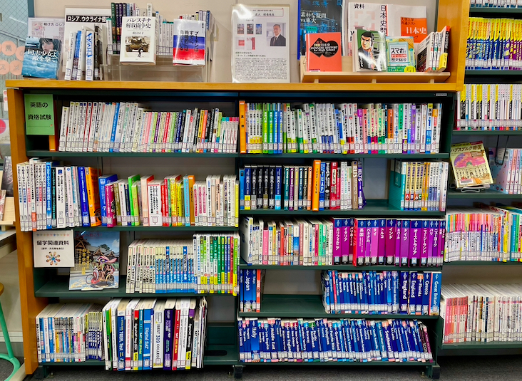 こちらは「英語の資格試験」や「留学」関連の資料をまとめた書架になります。帰国生向けの図書もたくさんあります。