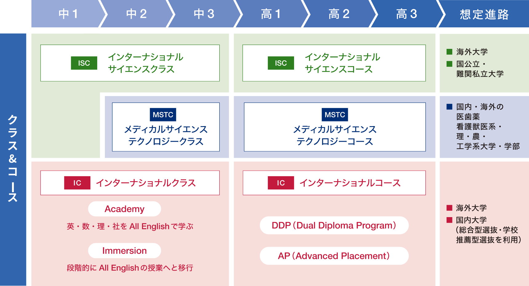 未来を見据えた教育を実現するために、インターナショナルサイエンス(ISC)、メディカルサイエンステクノロジー(MSTC)、インターナショナル(IC)の3つのクラス(中学)・コース(高校)を設置しています。ISCは、日本語と英語が自然に交じる環境で学び、基礎ゼミナールや卒業論文を通して、自ら計画を立てて学ぶ力や論理的に考え表現する力を育成します。MSTCは中学2年次から本格的な研究活動を開始し、調査・実験・紀要作成を通して探究力を磨き、高校では専門教員とともに自律的に研究を深め、課題解決力や科学的思考力を養います。ICは日本と海外の学びを融合し、英語で思考力や主体的学習力を育てるとともに、アクティブラーニングで問題発見・解決能力を伸ばします。高校ではAP(Advanced Placement)かDDP(Dual Diploma Program)を選択可能で、海外大学進学や二重資格取得にも対応し、国際的な学びの機会を広げます。これらのクラス・コースはそれぞれ異なる特性と魅力を持ち、生徒が自分の可能性を最大限に引き出せるような環境を提供しています。どのクラス・コースでも、生徒が将来の目標を実現するための力を磨いていくことが期待されています。