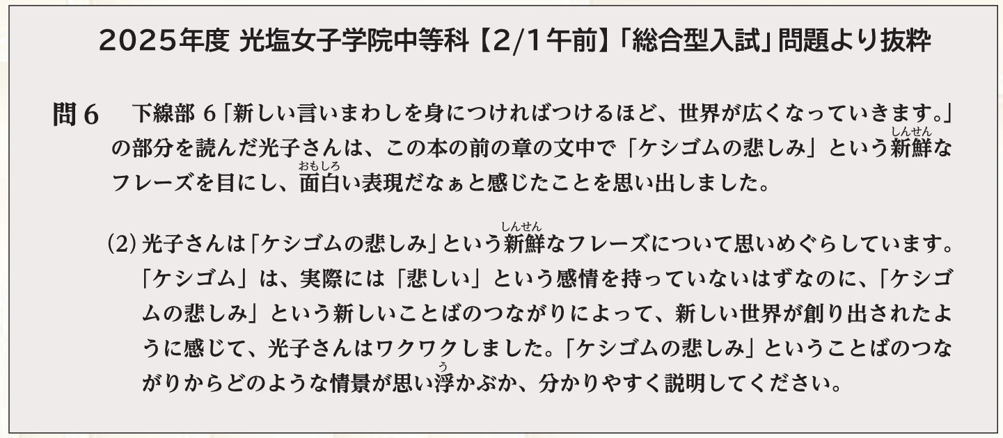 塚田先生: もちろん教科横断型という意味では「適性検査 型」との共通項はあると思います。でも光塩の「総合型入試」 は、いわゆる「〇〇型」のように型にはめる必要はないと思っ ていますし、都立校のどこかを意識して作問するというこ ともまったくありません。