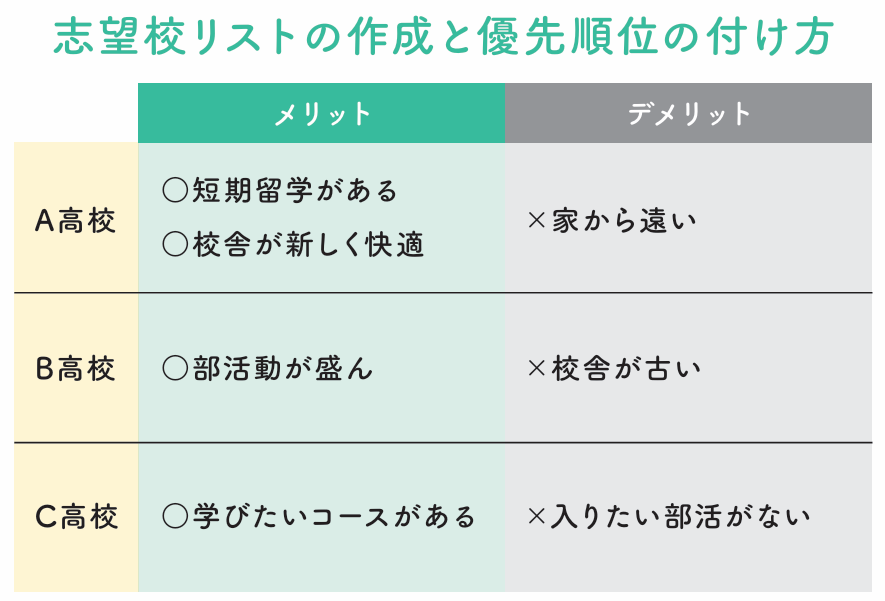 高校受験は、まず現在の学力を正確に把握することが志望校選びの第一歩です。自分の内申点や偏差値を基に、志望校の偏差値や入試の難易度を調べ、自分の学力に合った学校をリストアップしましょう。その後、学力だけでなく、通学時間や教育方針、クラブ活動、校舎・施設、進学実績など、現実的な部分も考慮して志望校選択を行いましょう。頭の中だけで考えていると整理がつきにくいので、学校のメリット・デメリットを書き出す志望校リストを作ってみるのも良いでしょう。