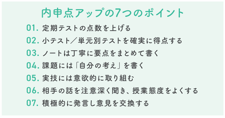 内申点の評定は、文部科学省が定める学習指導要領にある学習目標をどの程度達成できたかが5段階で表されています。内申点アップさせるには、学習指導要領に「これができるようになりましょう」と記載されている行動を取ることで評定は上がります。基本的には、授業内容をきちんと学び、周囲の人の意見も聞きながら自分の意見を持ち、その成果をしっかり伝えられるかが評定されます。そのためにテストや課題があり、授業に対する態度が評価対象となっています。内申点を上げるためには、数値化しやすい定期テストが重視されますが、その他のポイントも意識して対応していくことが大切です。