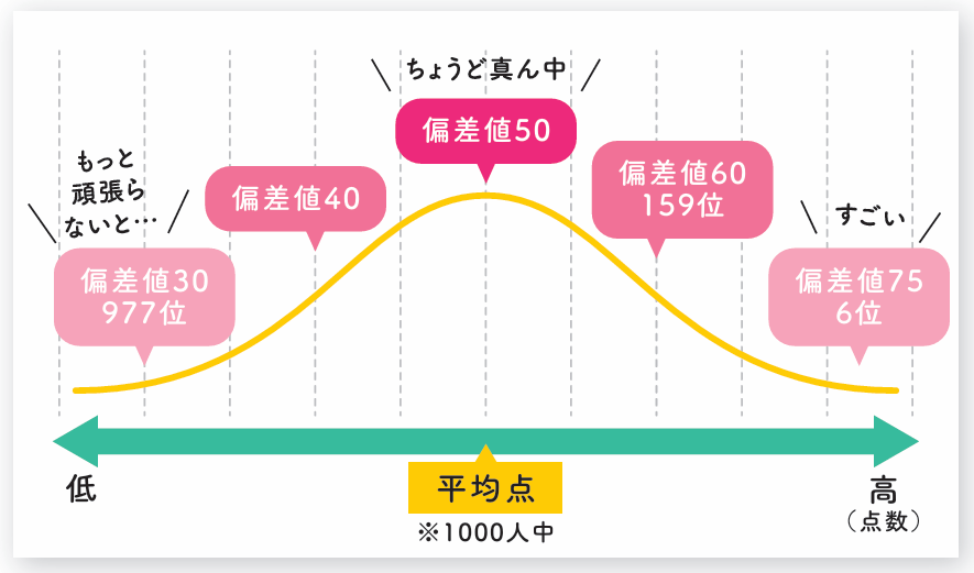 偏差値とは、試験を受けた集団の中で、自分の成績がどの位置にあるかを示す数値です。例えば、テストを2回受けて両方とも80点だったとしても、テストの難しさは毎回違うので、1回目のテストと2回目のテストで、どちらが良い結果だったのか点数では判断がつきません。そんなときに利用するのが「偏差値」です。平均点を偏差値50として、それより高ければ平均より上、低ければ平均より下と判断します。