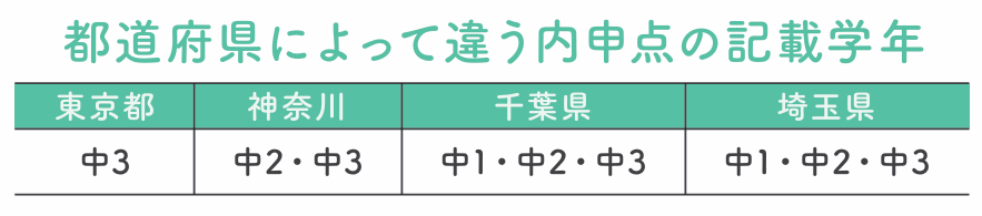また内申点の取り扱いは都道府県によって違いがあり、例えば内申点の評価対象になる学年が中1・中2・中3のところもあれば、中3のみのところもあります。さらに、中学3年時の評定は、学年末までは含まれず、2学期制と3学期制で対象となる期間が異なりますので注意が必要です。