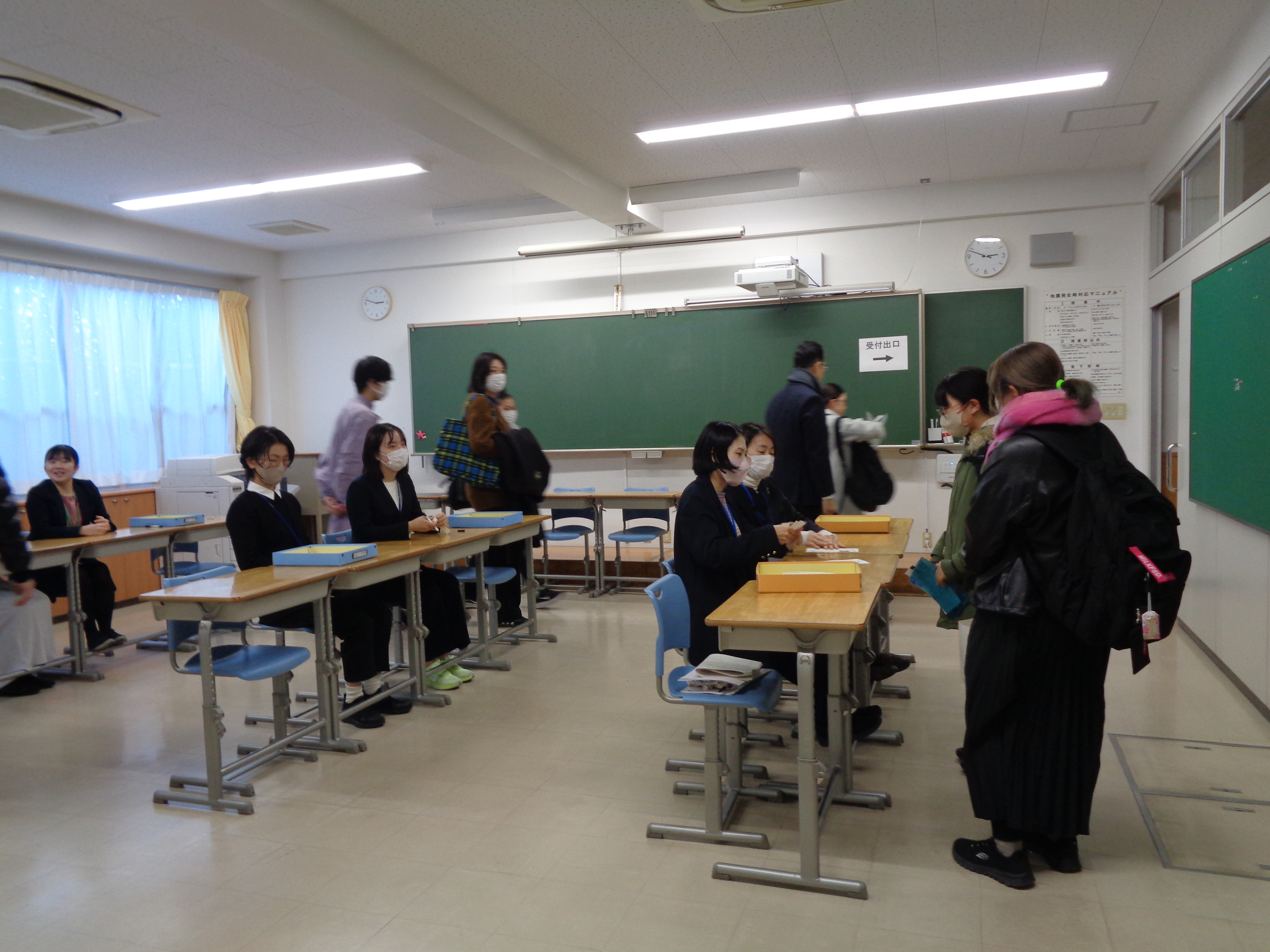 受験生は自分のカバンから受験票を取り出し、空いている受け付け場所で先生に受験票を見せて受け付けを済ませます。