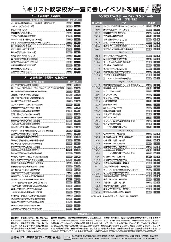 相談ブースのほかにも、会場の青山学院中等部2階の礼拝堂では、参加校による「5分間スピーチリレー」が行われ、会場への参加校のほか、私立中学校・高等学校は計25校、私立小学校は計12校が資料参加(提供)してくれています。