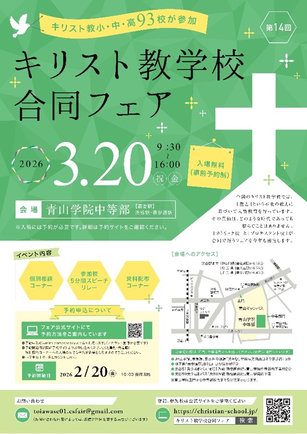 2026年3月20日(金祝)には、キリスト教学校合同フェアが青山学院中等部で開催されます。