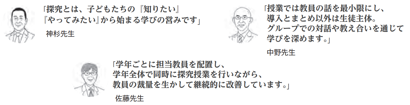 【神杉先生】探究学習の本質は「生徒主体」という言葉に集約されると感じています。城西大学附属城西ではコロナ以前から探究型の学びを進めており、振り返ると従来の授業にも探究的な要素が内在していたことに気づかされます。 本校は創立107年を迎えますが、2代目学園長・野口援太郎が実践した「大正自由教育」はまさに探究の原点でした。池袋西口の自宅で行われた児童教育では、子どもたちが昆虫や花、物語など自らの興味を起点に学びを深め、自由な対話や創造を通じて「小さな図書館」を作るなど、環境全体が学びの場となっていました。これは、答えありきではなく、子どもの速度で深掘りする現在の探究学習に通じます。 現在は中高一貫校として探究を再構築し、教員はファシリテーターとして生徒の関心を拾い上げ、対話を通じて学びを導いています。AI の登場など急速な社会変化の中で、私自身も「今、何が子どもたちにとって最良か」を問い続けています。 探究の具体例としては、修学旅行を「海外研修」「国内研修」と位置づけ、ハワイでは多様性や文化、台湾ではアジア共通の課題、国内では地域課題を通じた自然・自己探究を実施しています。探究とは、子どもたちの「知りたい」「やってみたい」から始まる学びの営みです。これからも時代の変化に応じ、柔軟かつ誠実に探究を育んでいきたいと考えています。