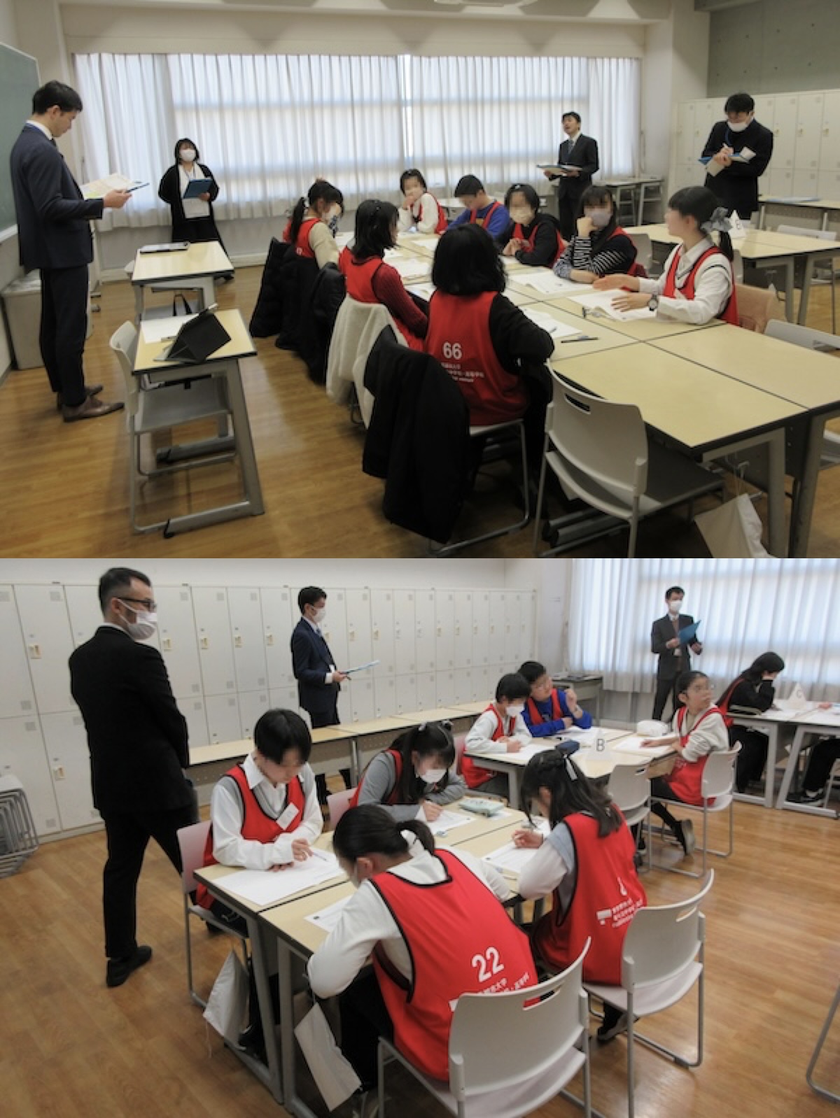 午前7時30分、最初の受験生が姿を見せました。試験会場と待合室を兼ねた「つばさホール」には、8時10分の時点で既に半数以上が揃います。受付を済ませた受験生は、会場で赤いビブスとネームカードを受け取ります。このビブスは検査Ⅰの作文から着用し、そのままグループワークへと続きます。8時30分、出欠確認が始まると先生方が一人ひとりの顔とビブスの番号を丁寧にチェックします。67名が挑む倍率9.6倍——その数字を知ってなお、この入試を選択した受験生たちの表情には、緊張と静かな覚悟がにじんでいました。
