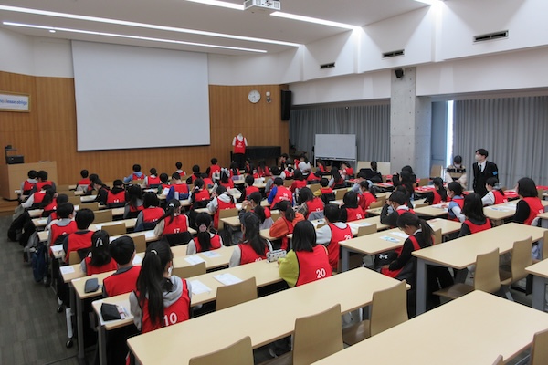 9時35分、在校生の誘導で受験生たちは6つの検査室に分かれていきます。