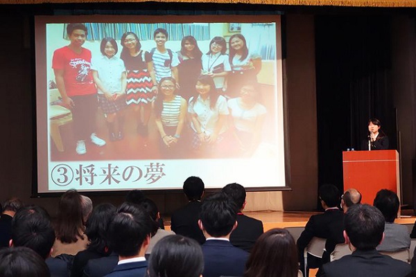 まず、英語のスピーチでは、スクールワークで行った様々なテーマの説明がありました。「21世紀における役割」「世界一大きな授業(英語・日本語)」「多様性 Divesity」「写真で学ぼう! 地球の食卓」「援助する前に考えよう」「海外フィールドワーク先の現状」「ボランティアにとって大切なこと」「貿易ゲーム」など10以上のテーマがアクティブラーニングのスタイルで行われたことが紹介されました。