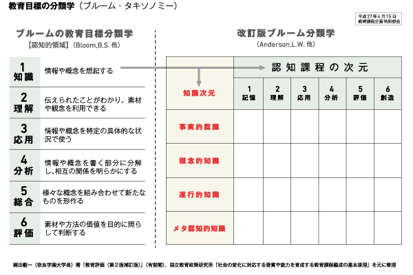知識や思考力という概念に何らかの枠組みを与える試みは、過去に数多くなされてきた。有名なのは1956年にB.S.ブルームらが開発した「教育目標分類学(通称ブルーム・タキソノミー)」である。もともとは大学の試験問題を作成・評価するに当たって、関係者の共通言語をつくり認識をそろえる目的であったが、それが教育目標を示すのにも活用されるようになった。