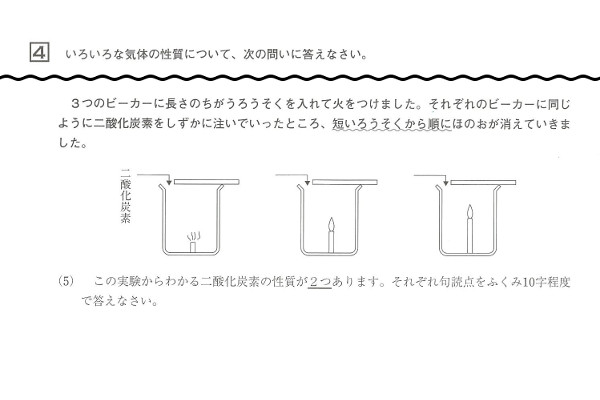 三瓶 問題を見て気になったのは、情報量の少なさです。例えば、ビーカーに二酸化炭素を入れた後、最初に短いろうそくが消え、次に真ん中のろうそくが○秒後に消え、最後に残ったろうそくが□秒後に消え・・・、といった形をグラフで示すこともできたと思います。二酸化炭素を入れてからの時間の経過とろうそくの火が消えるまでの時間の関係を、グラフで視覚化にしておくことで受験生はもっとイメージしやすかったのではないでしょうか。