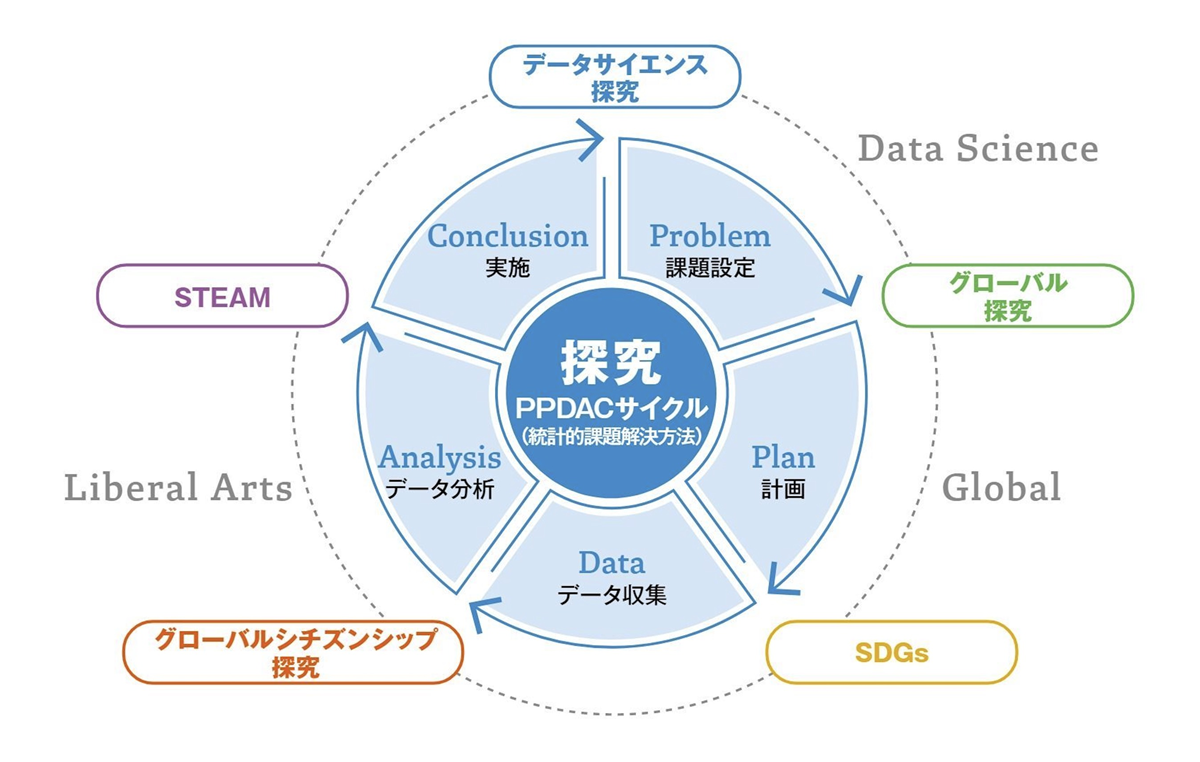 DSコースは、「データサイエンス探究」・「グローバル探究」・「SDGs」・「グローバルシチズンシップ探究」・「STEAM」という5つの探究科目を統計的課題解決(PPDAC)サイクルを援用しながら、文理融合・教科横断型で相互に作用させていることが特徴です。