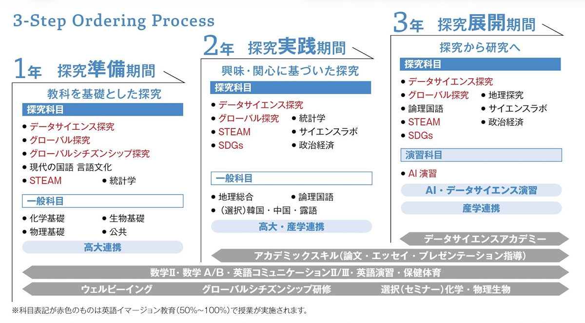 カリキュラムは3年間で探究準備期間・探究実践期間・探究展開期間を得て、探究学習を完成する仕組みを敷いています。