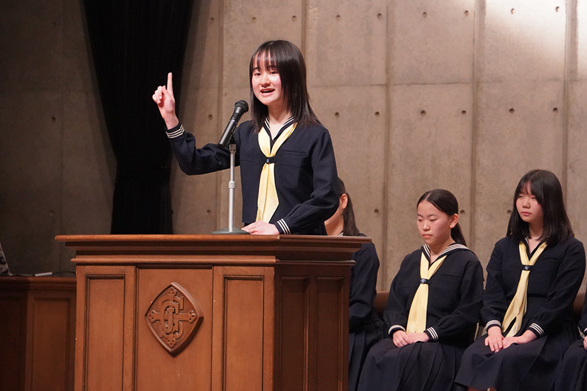 英語でエッセイを書き、各学年から選ばれたファイナリスト3名が校内コンテストに出場。ファイナリストはネイティブ教員からマンツーマンで指導を受けて本番に臨む。コンテストはすべて英語で進行され、外部から招かれたネイティブ講師がジャッジを担当。